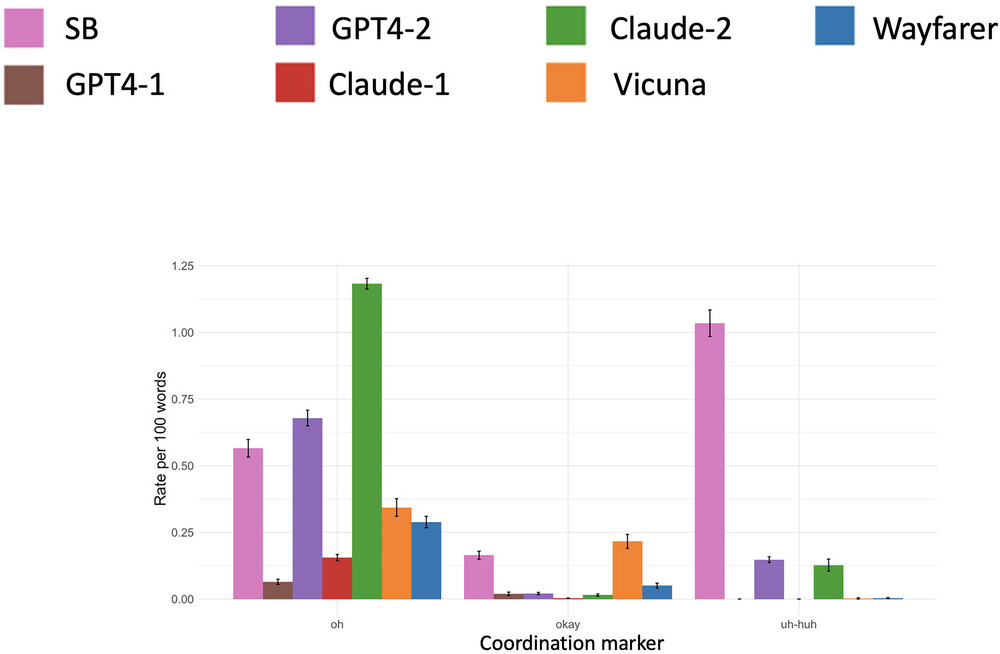 У реальних повсякденних розмовах більшість людей переважно використовують короткі слова, що називаються “дискурсивними маркерами”. Це такі слова, як от “так”, “ну”, “ніби”, “у будь-якому разі”. Ці слова виконують певну соціальну функцію, сигналізуючи про зацікавленість, приналежність, відношення або значення для іншої людини. LLM досі погано орієнтуються у використанні цих слів, використовуючи їх по різному і часто неправильно. Це допомагає людям розрізняти їх.
