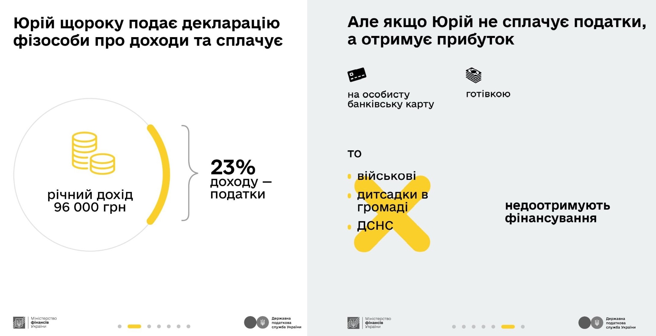 “Якщо Юрій не декларуватиме доходи і торгуватиме криптовалютою через “сірі” майданчики, а прибуток отримуватиме готівкою чи як Р2Р переказ на банківську картку і не сплачуватиме податки, тоді військові не матимуть кровоспинного бинта, щоб зупинити кровотечу побратимові і врятувати йому життя, а бригада ДСНС не зможе гасити пожежу після обстрілів”, — кажуть ДПС та МінФін.